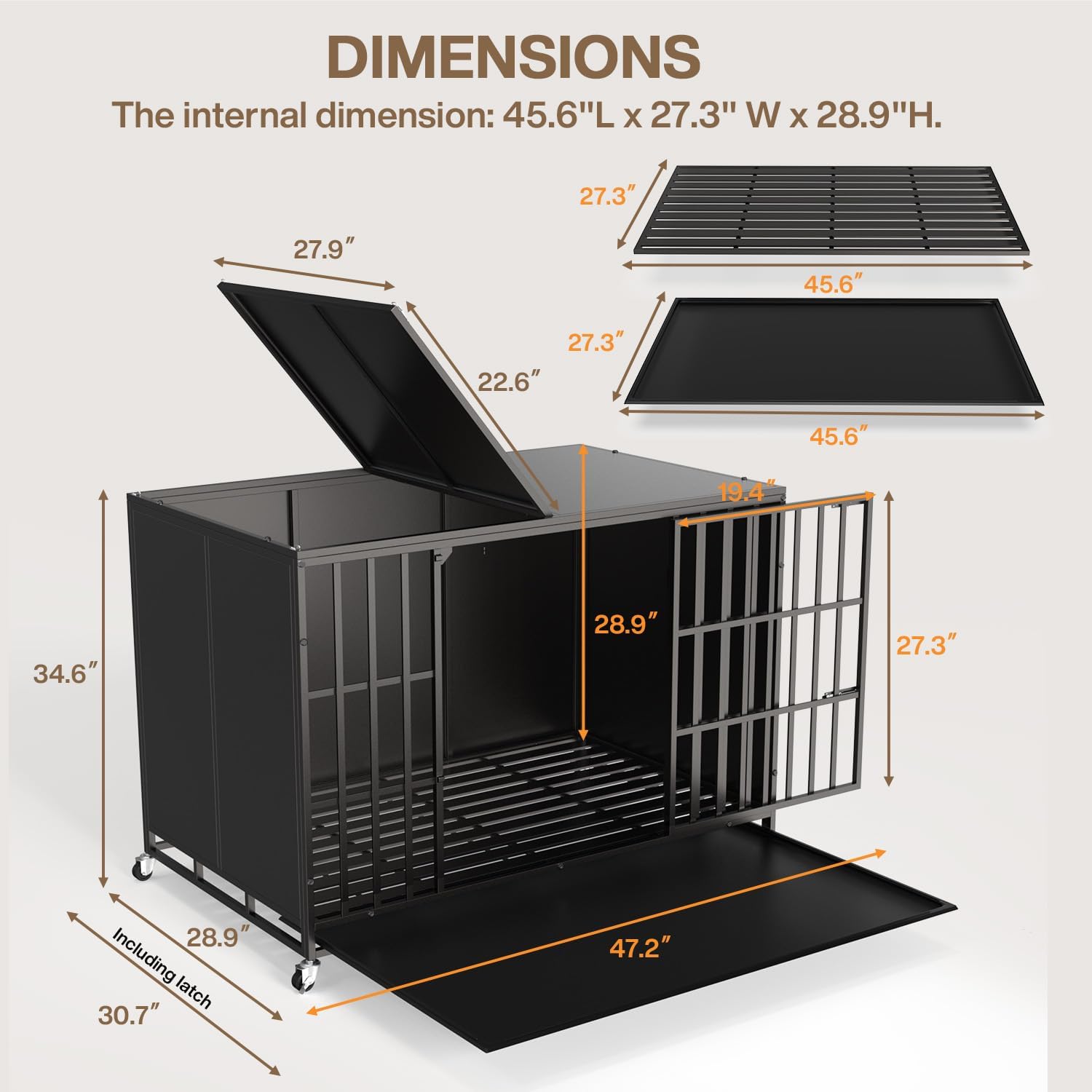 LEMBERI 48/42 inch Heavy Duty Indestructible Dog Crate, High Anxiety Extra Large Dog Cage for Large Dogs, XL Steel Escape Proof Dog Kennel with Wheels and Removable Tray (Black, 47.2*30.7*34.6 inch)