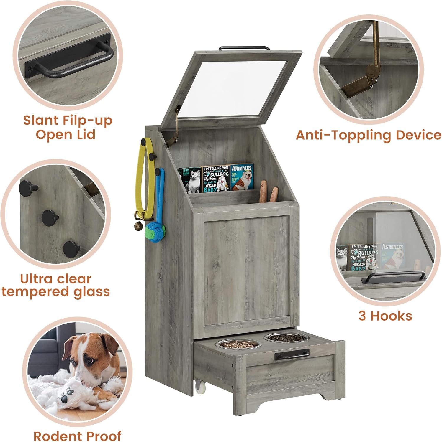 - Flip-Type Food Storage Cabinet: Equipped with a high-definition glass flip cover that lets you easily check food levels while keeping dust out, ensuring your pet’s food stays fresh and clean.